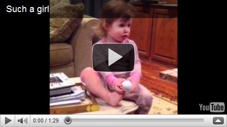Yes. At the ripe old age of 20 months, she knows just what to do with a file, nail clippers, nail polish, and pumice stones. She found my PedEgg the other night and insisted that someone use it on her feet. Now, when I say, “insisted,” I mean insisted. She sat up on the coffee table and hollered, “Toes! Toes! Toes!” until we were more than happy to accommodate. At one point she got so into the whole pedicure thing that she reclined back on her elbows while Daddy was working on her feet.